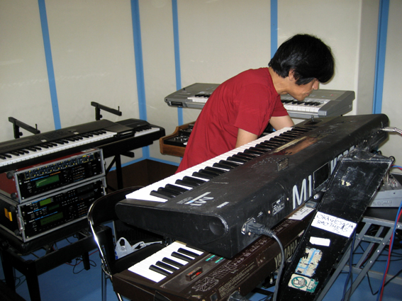 写真のようにセッティングされたハードウェア群は11年前のそのまんまのスタイルを固持している。それはただのこだわりなどと言う生温いものではなく、今回数十万円を新たに投じて当時のセッティングを完璧なまでに再現しつくしたその裏には、「頭ではなく身体が楽曲を覚えている」という一子相伝心技体金城流鍵盤打奏奥義継承者としてのプライドが見え隠れする。