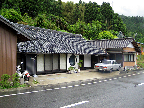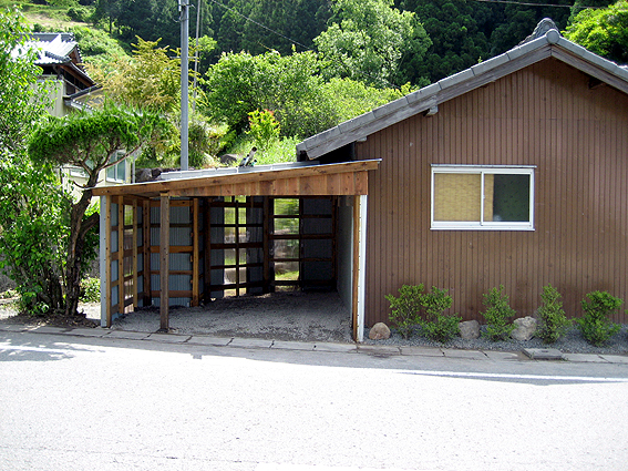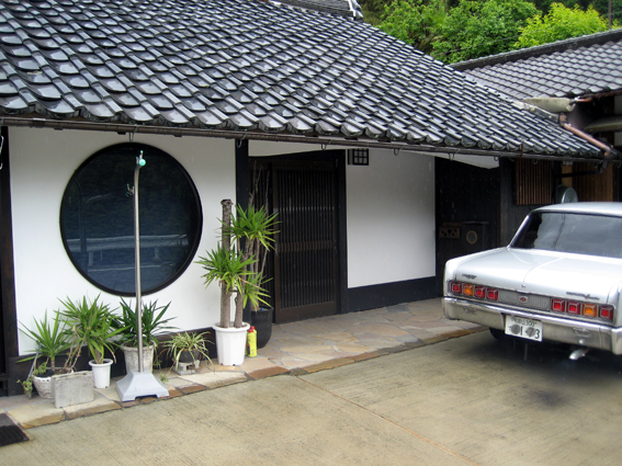 家の敷地は国道に面して細長く、このガレージが左の端でその隣に写真の離れが一棟、そしてリフォームした母屋があって、一番上の写真に写ってる俺の車の前が俺の仕事部屋を含めて3部屋の家屋が一棟、その横にはちょっと小高い畑があって、右端に少し大きな倉庫(物置き)が写真の通り建っている。